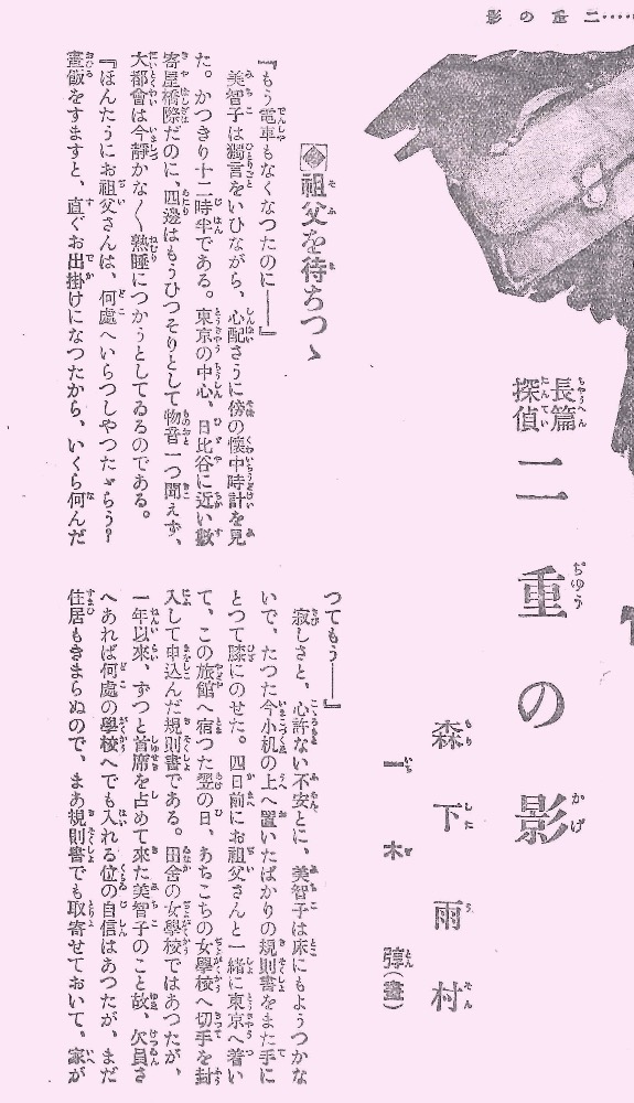 さて、もう一つの収録作品は「二重の影」です。『少女倶楽部』大正12年1月号から4月号まで掲載されたものになります。こちらの方は、「森下雨村」名義でした。表題の「二重の影」は「にじゅうのかげ」と読みます。「ふたえのかげ」と読みそうですが、そうではなくて、連載開始の表題を見てもらうと「重」に「ぢゆう」とルビが振ってありました。以下の画像をご覧下さい。