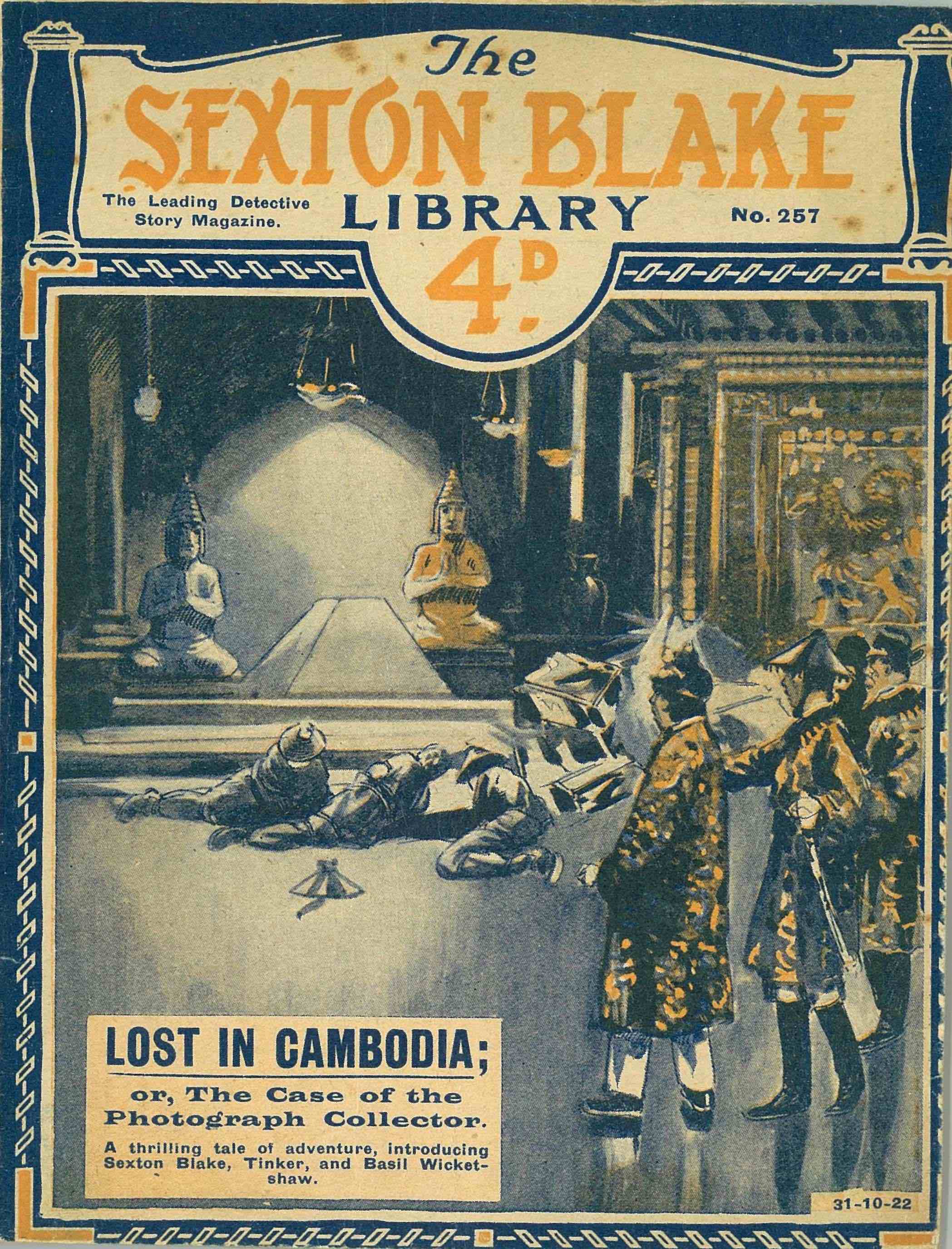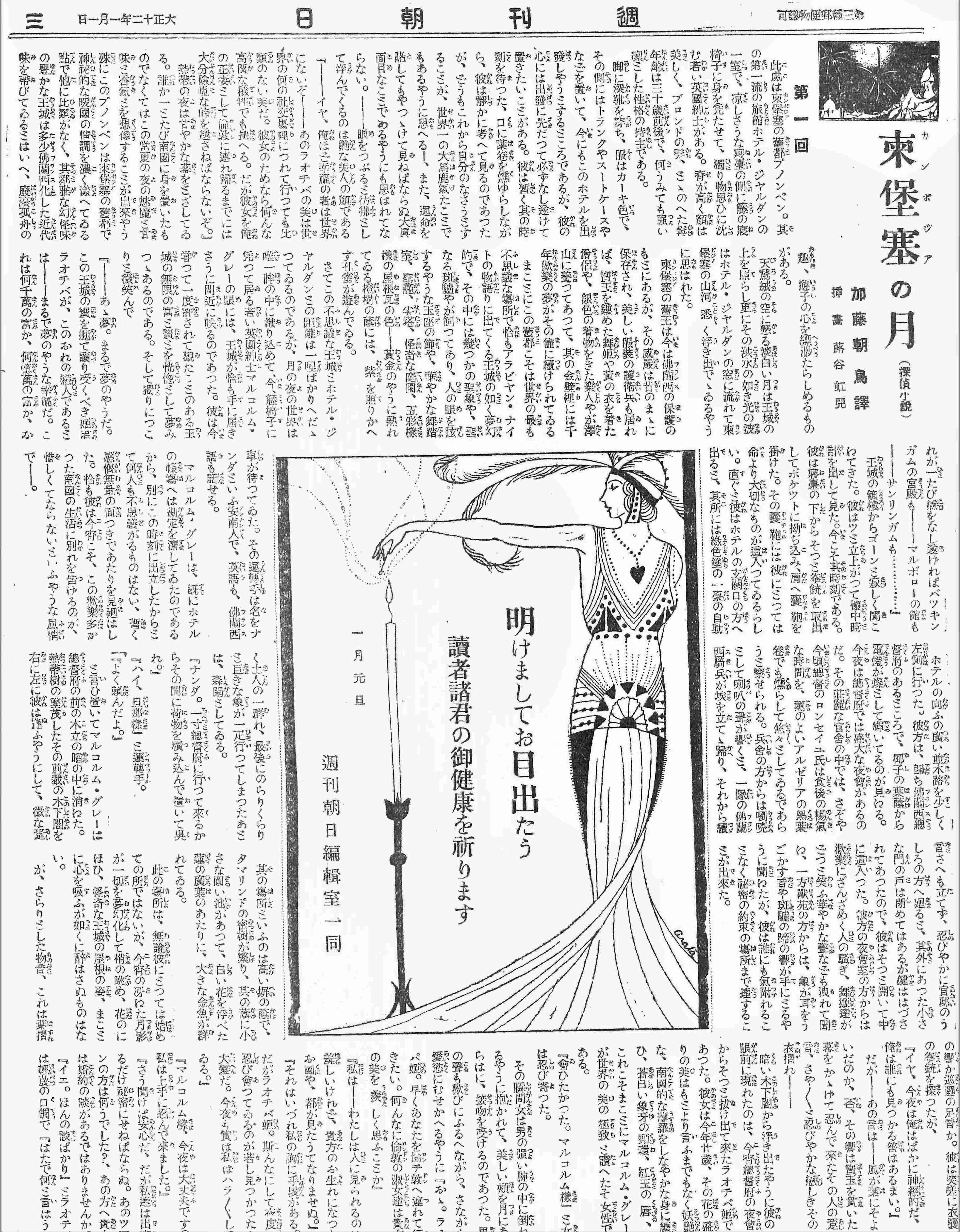 今回紹介する『柬埔寨の月』は、加藤朝鳥が『週刊朝日』大正12年1月1日号から6月3日号にかけて、全二十三回で連載したものを単行本化したものです。原題は”Lost in Cambodia;The Case of the Photograph Collector”(The Sexton Blake Library Ser.1 No.257,October 1922)になります。