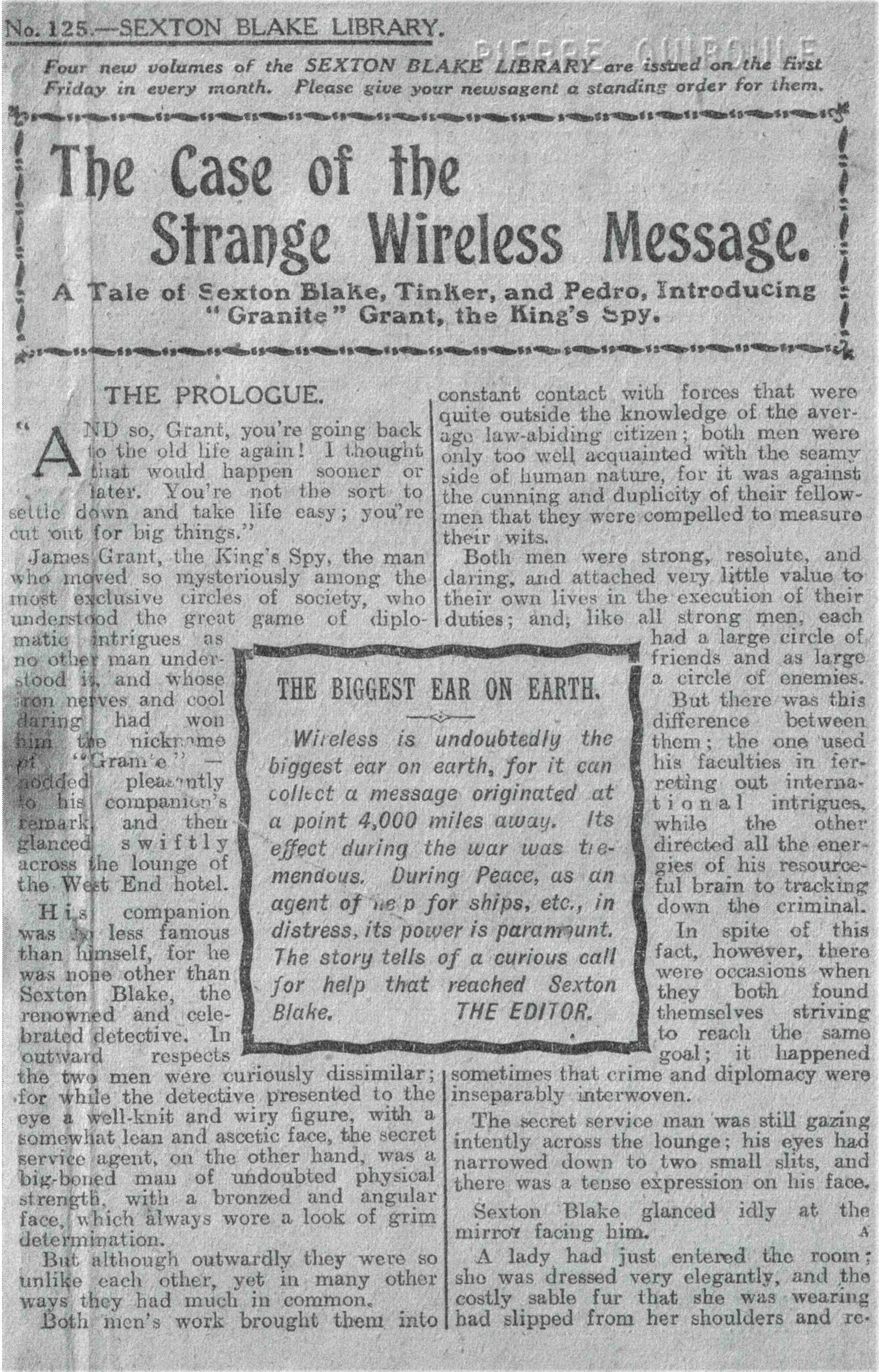 この物語は、セクストン・ブレイク探偵が、カリビアン海にいると思われる秘密探偵ジェムス・グラニット・グラントを救助するために、助手のチンカー、愛犬ペドロともに、小型快速船ナンシイ号で出向く話です。ここで、題名に使われている「無線電信」が意味を持ってきます。