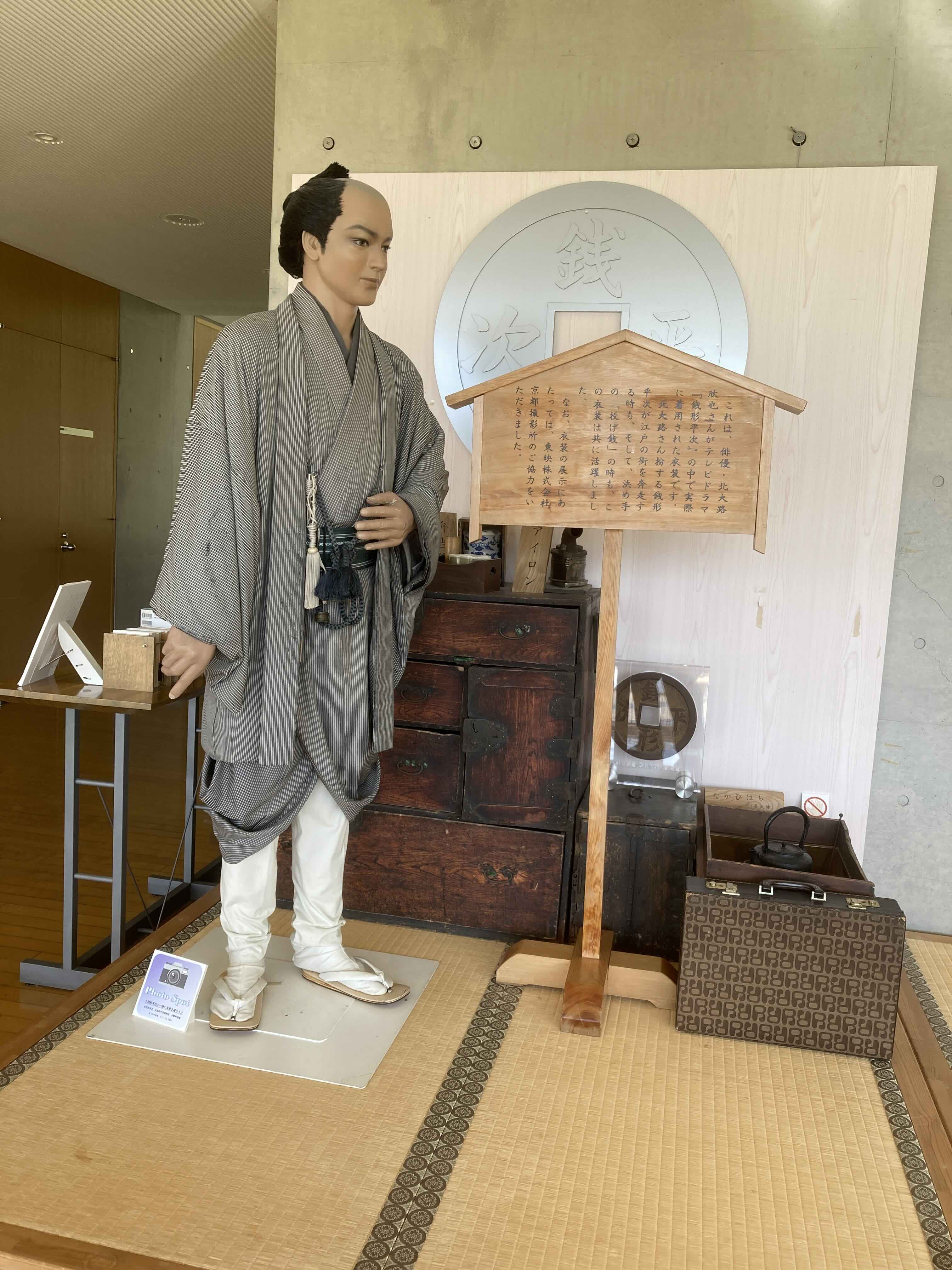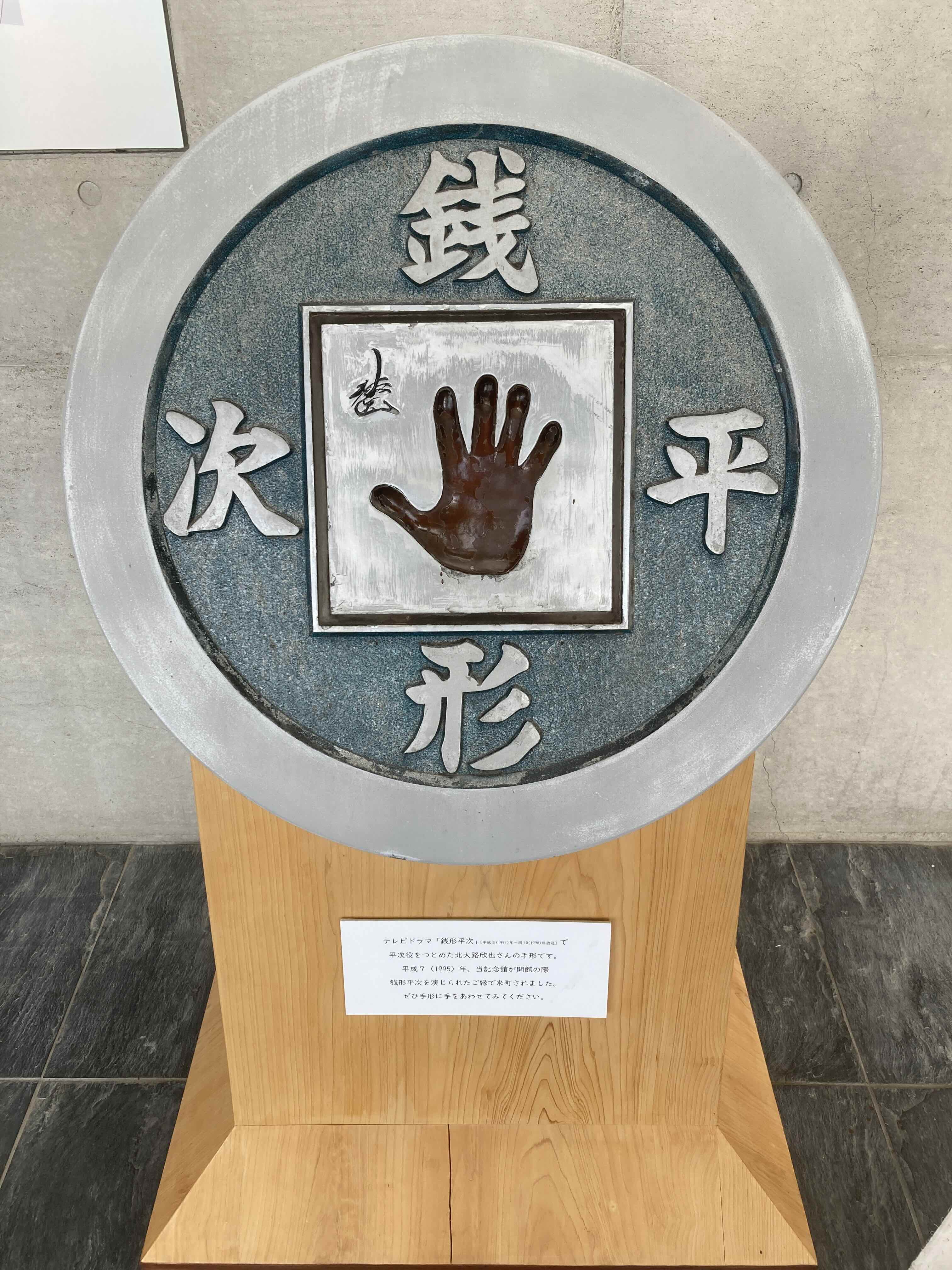 入り口手前にあるのが、この寛永通宝のオブジェ。真ん中の手形は、テレビドラマで銭形平次を演じた北大路欣也でした。