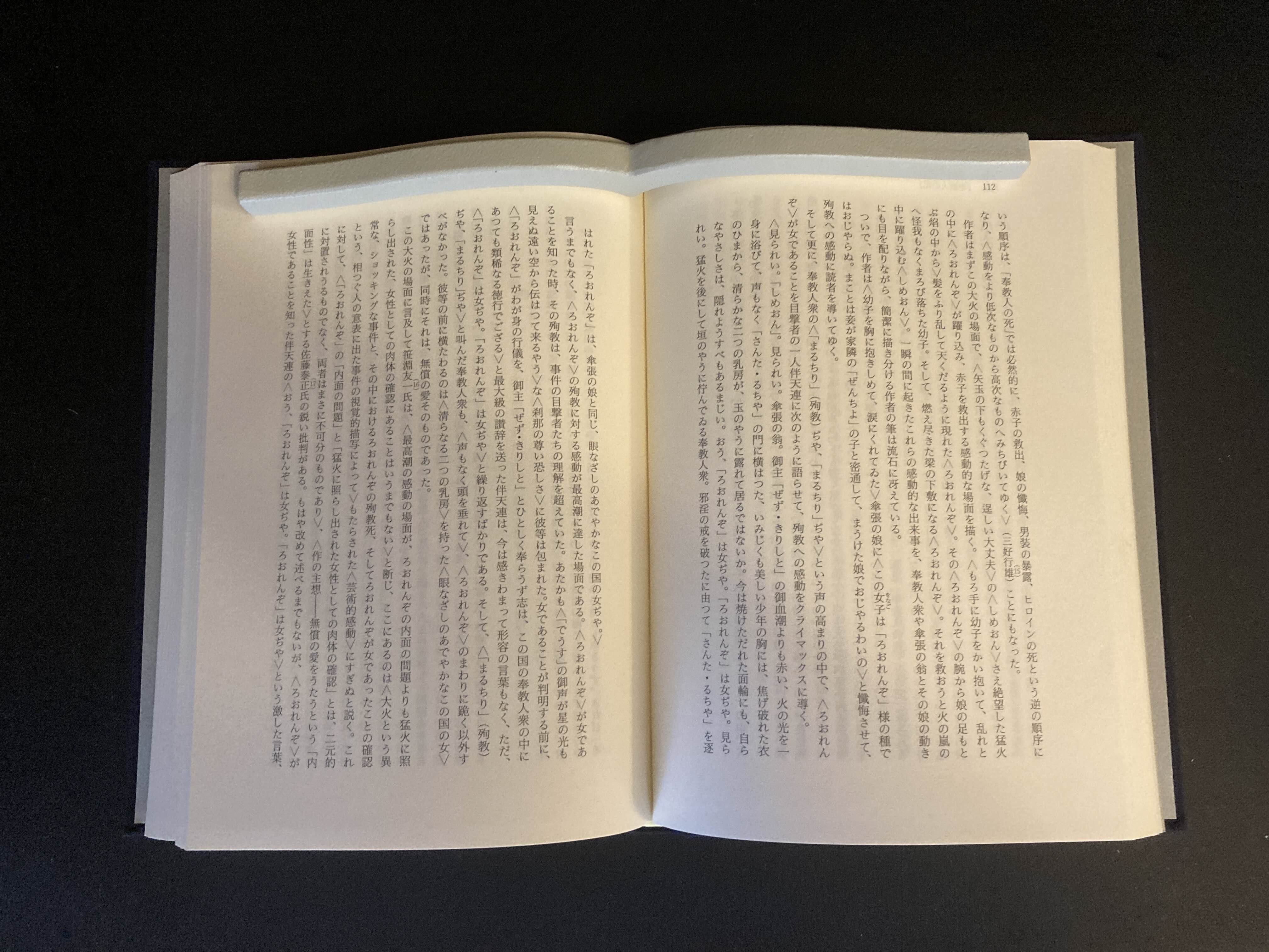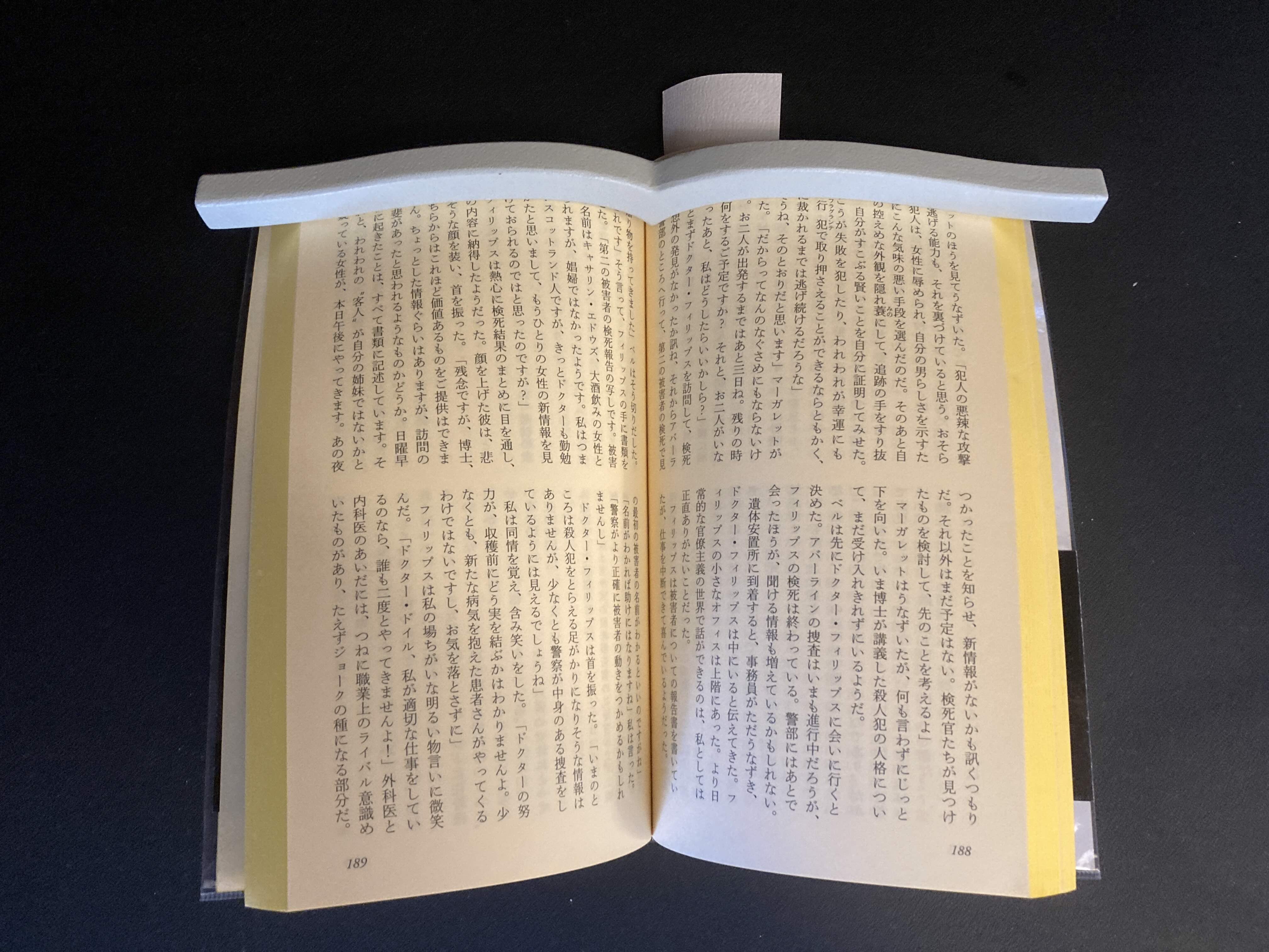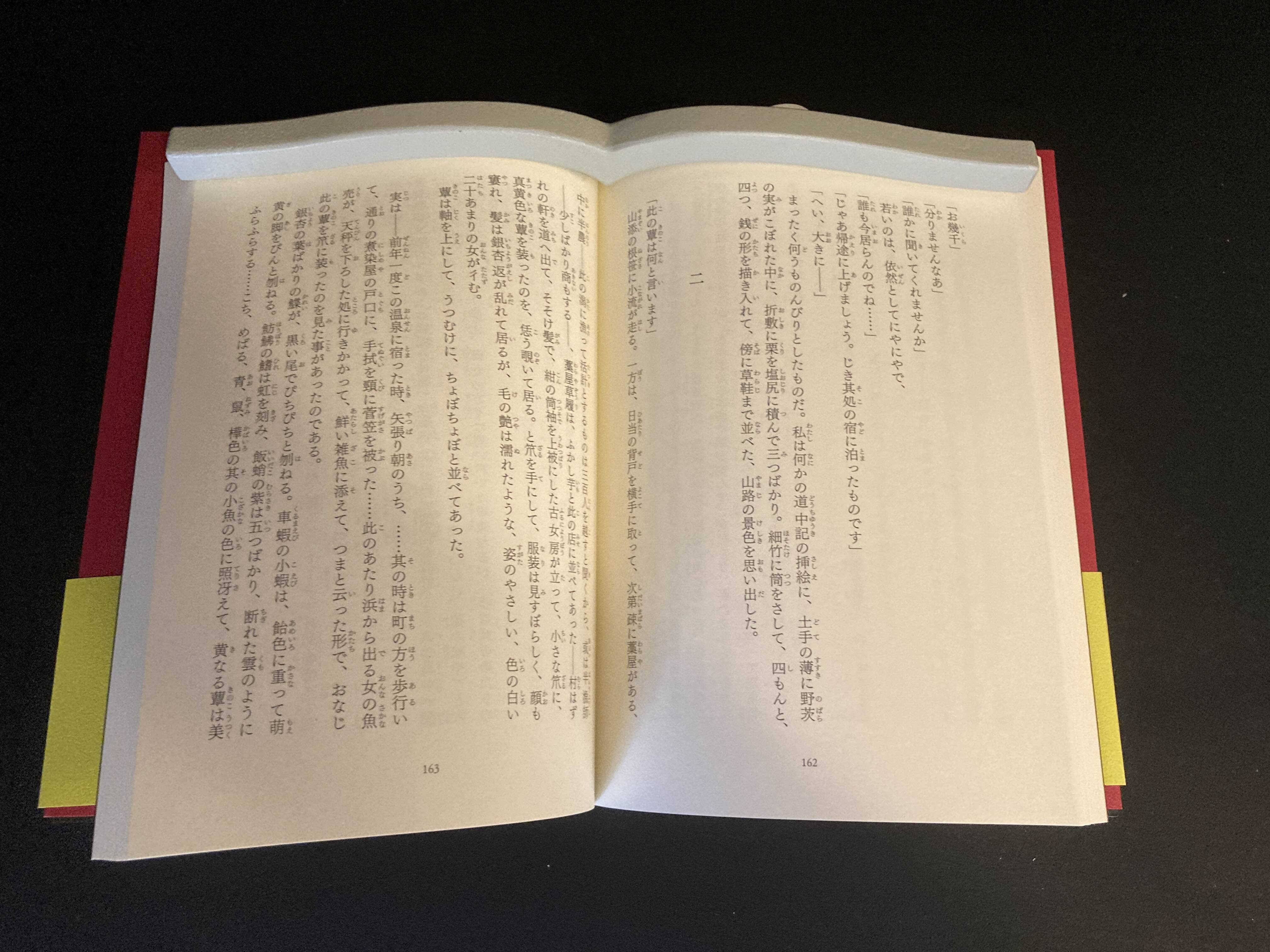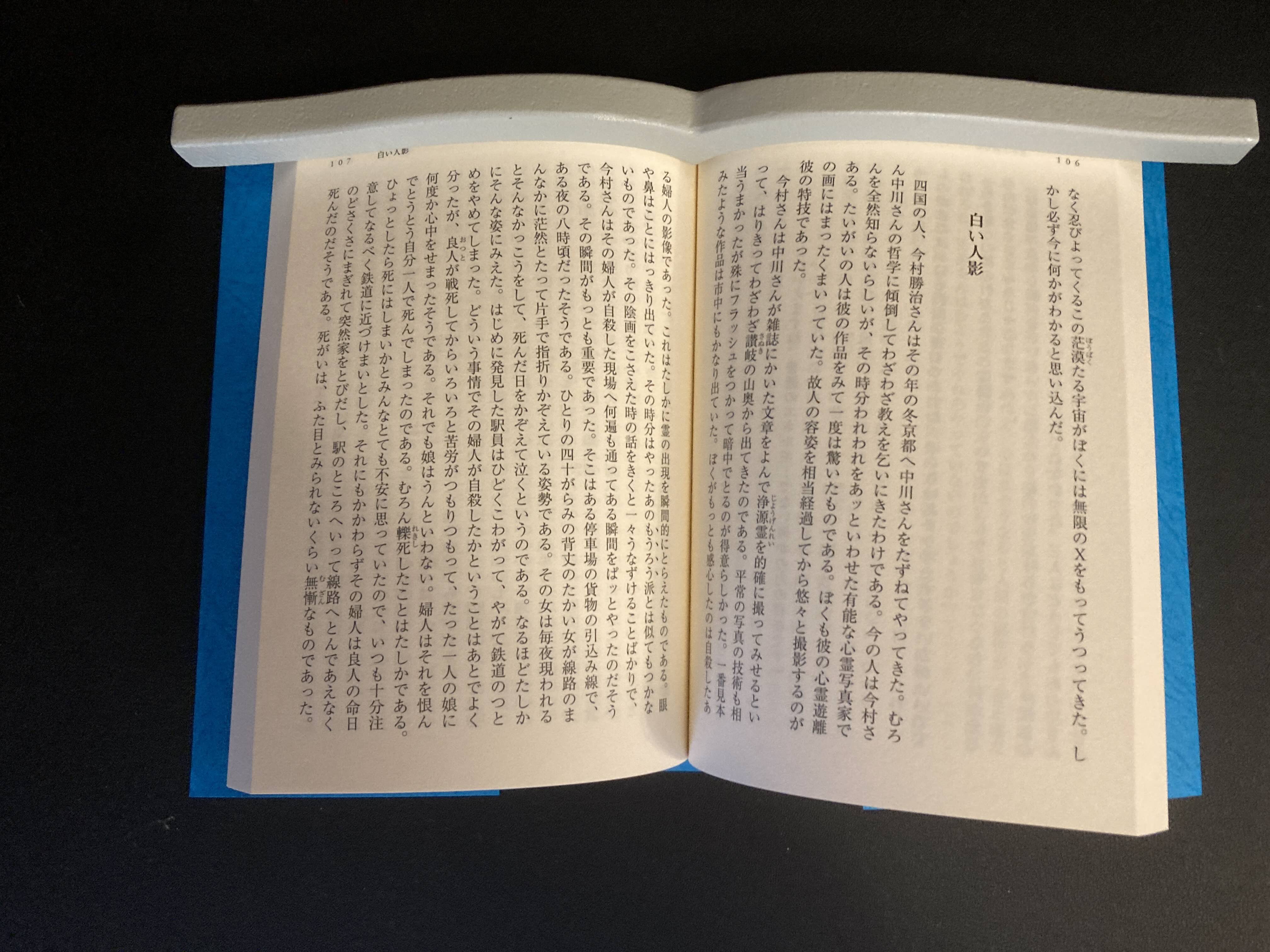 文庫本です。一応開いたままになりますが、下部が斜めになっていますね。オーバーヘッドスキャナーで撮影するには、ちょっと心配です。下にももう一本置けば完璧でしょうかね。